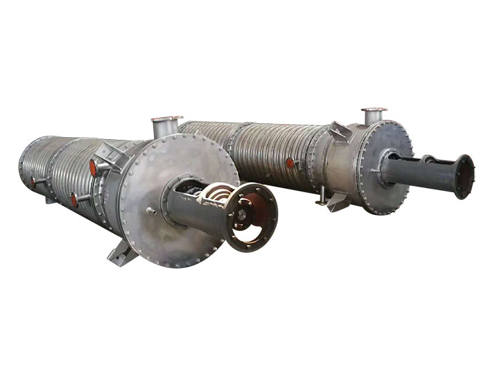 刮板薄膜蒸發(fā)器是殼體外部裝有加熱蒸汽夾套,其內(nèi)部裝有可旋轉(zhuǎn)的刮板,刮板由圓筒中心的旋轉(zhuǎn)軸帶動。原料液由蒸發(fā)器上部沿切向加入后,在重力和旋轉(zhuǎn)刮板的帶動下,沿殼體的內(nèi)壁面形成下旋的薄膜,完成液由底部排出器外,二次蒸汽則經(jīng)除沫器后由上部排出。這種蒸發(fā)器的突出優(yōu)點是對物料的適應(yīng)性很強,對高黏度、易結(jié)晶、易結(jié)垢、含懸浮物或兼有熱敏性料液的蒸發(fā)均適用。